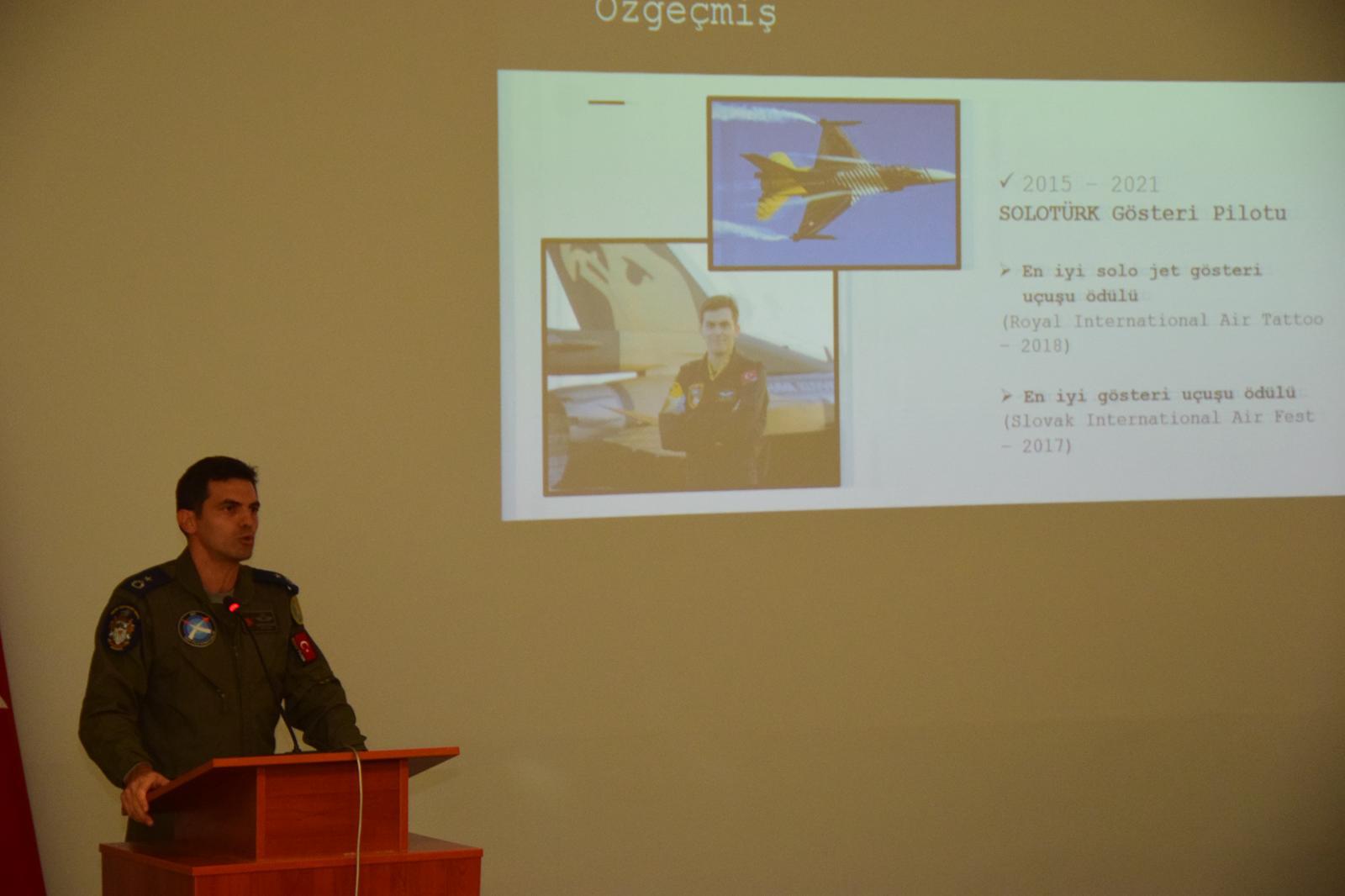 Within the scope of the conference series organized by HUZTAM, operating under the Eskişehir Osmangazi University (ESOGÜ) Department of Aeronautical Engineering, 401st Squadron pilot and former Solotürk Pilot Major Serdar Doğan met with students.