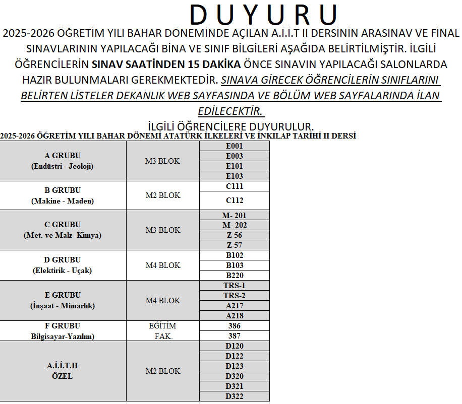 A.İ.İ.T II DERSİ ARASINAV&FİNAL SINAV BİNA VE SINIF BİLGİLERİ